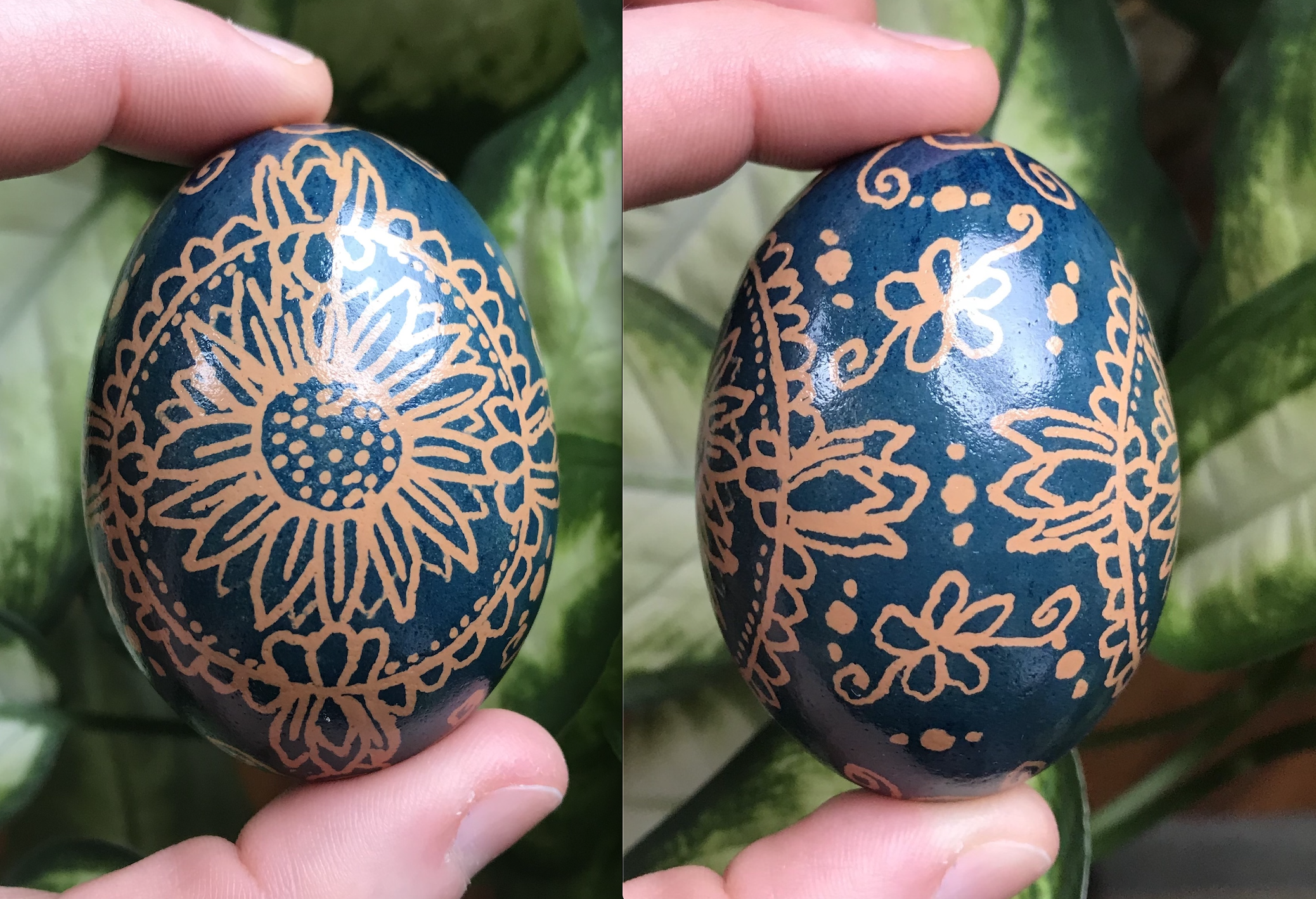 Pysanka is the traditional art of Ukranian Easter egg decorating. My grandmother Joan is a master at this, and she was kind enough to pass down her knowledge to me! The process involves using melted wax to create designs on the egg and then dyeing it different colors. At the end, you “blow” the egg to empty out the yolk. I am a beginner, but I already love this!