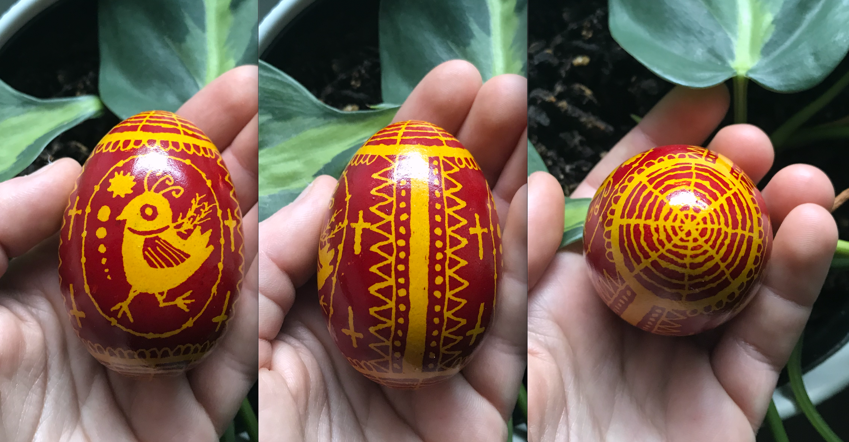I made this egg on Easter Day 2021 shortly after returning from my grandparents’ house. My grandma gave me a few books of pysanka designs and I was inspired by the deeper meanings of each symbol. The bird represents new life and fertility, while crosses are representative of the Christian faith. Together with the royal colors of gold and crimson, I think the symbols in this egg are nice tribute to the Easter holiday!