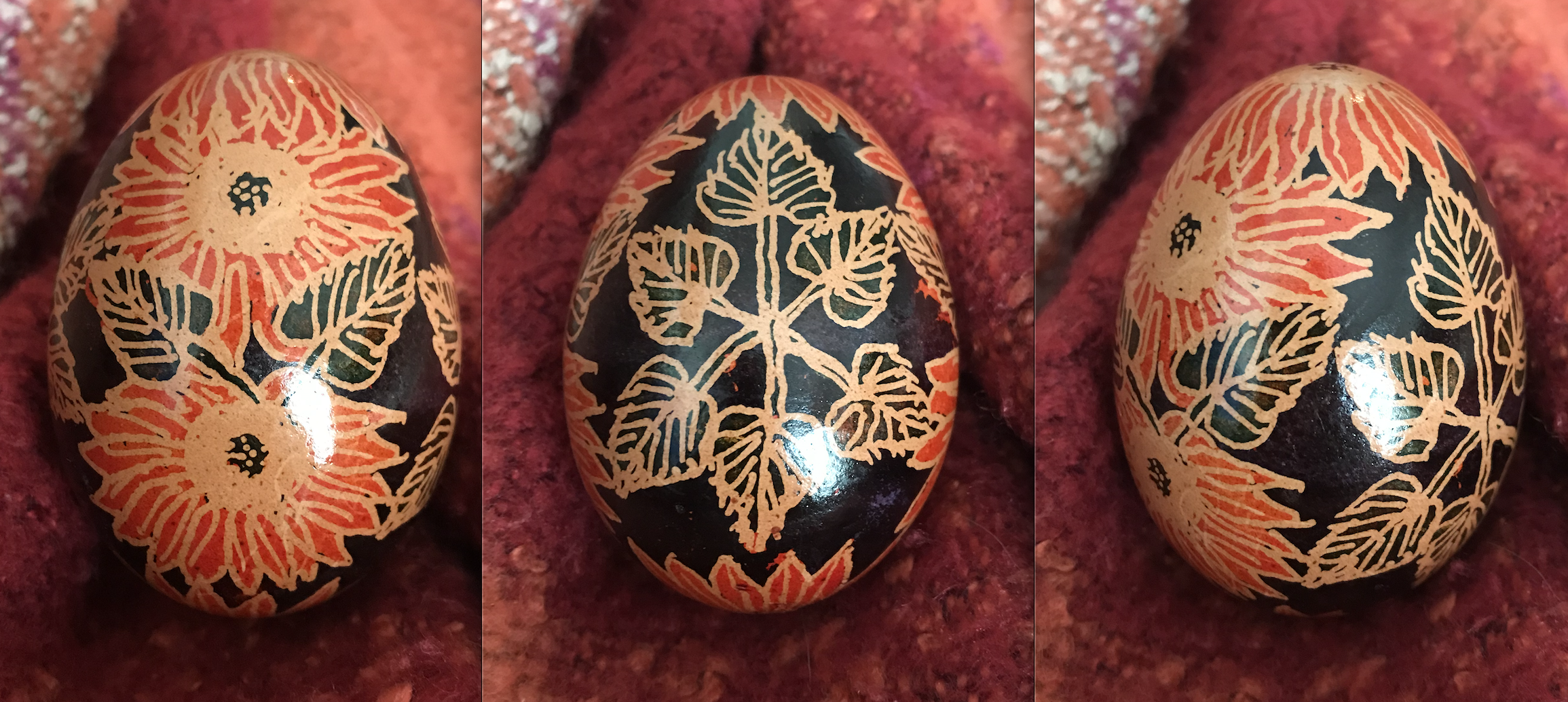 This nontraditional pysanka is one of my new favorites! I steeped the egg in purple dye for so long that it created an almost black backdrop for the bright flowers.