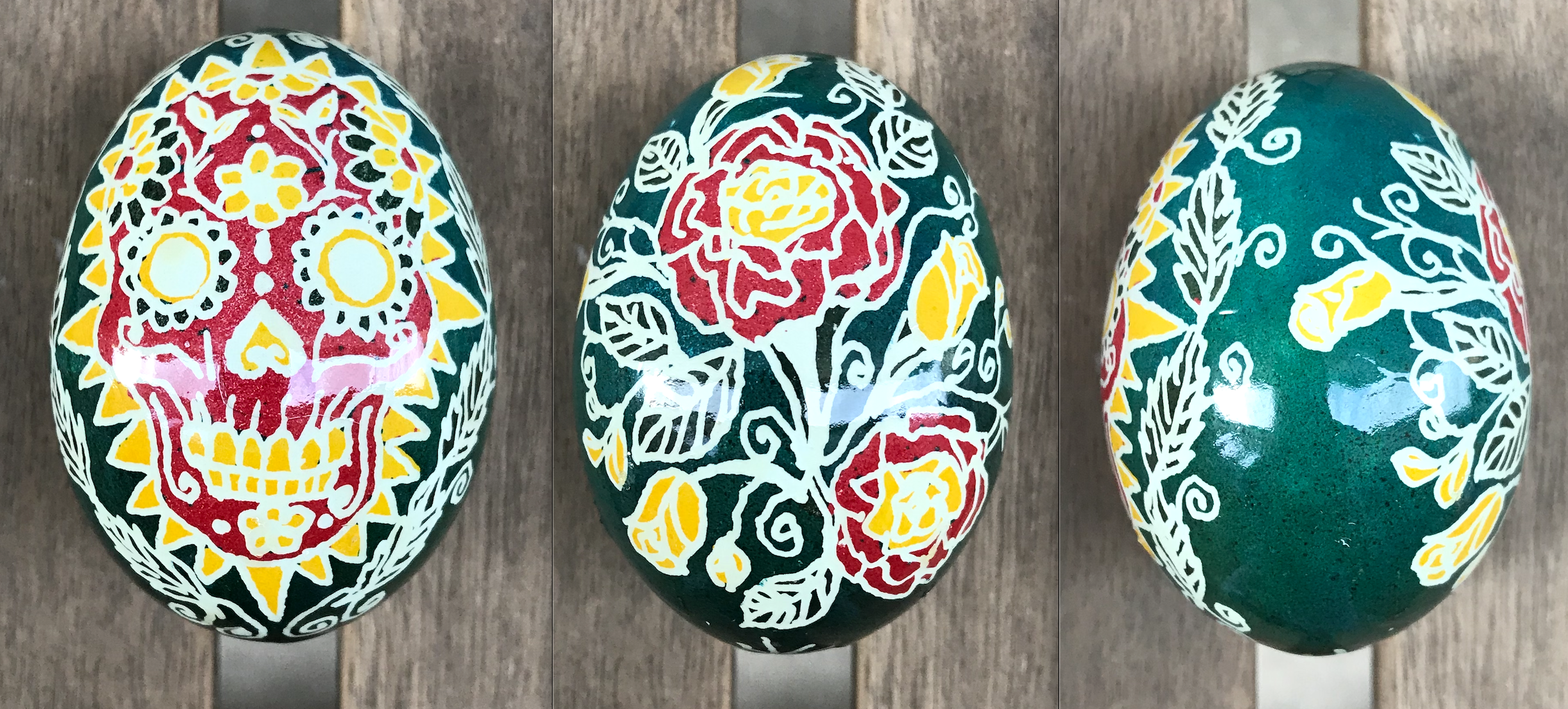 I made this egg as a tribute to the beautiful colors and motifs associated with Día de los Muertos in Mexican culture. The design on the front is a calavera (sugar skull). I am also creating a photo album to show the step by step process of creating this egg.