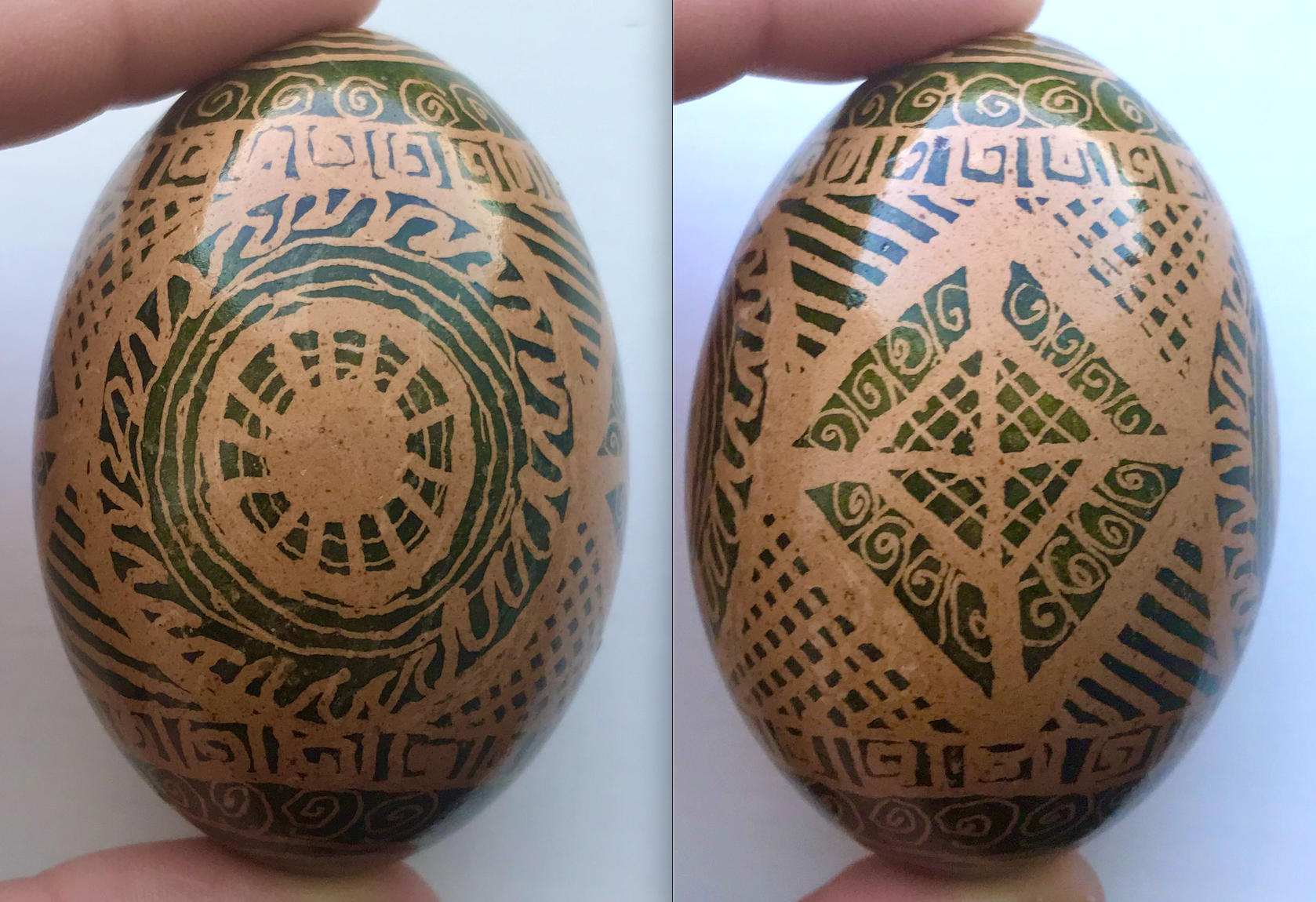 This was a “just for fun” project that turned out better than expected! I was experimenting with different patterns and stylus diameters to create a tribal effect. This is a natural brown egg with a single coat of dark green dye.
