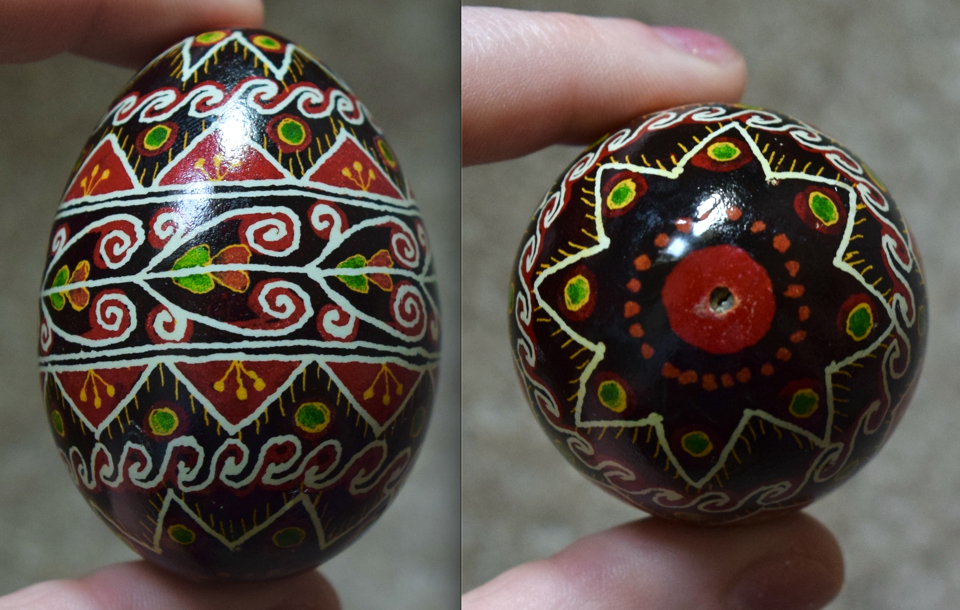 This was one of my most technically challenging eggs to date and I am happy with how it turned out! I also experimented with dabbing small amounts of dye on isolated parts of the egg with a cotton swab rather than submerging the entire egg in the liquid dye.