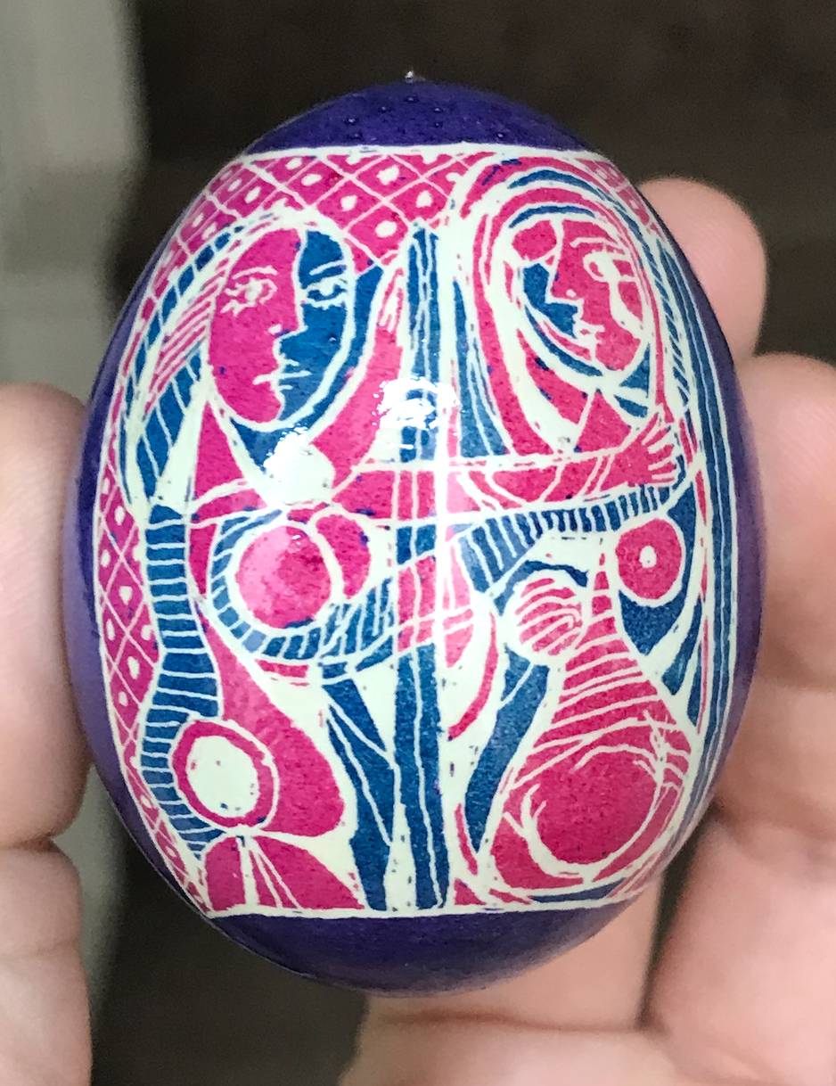 This egg was inspired by the 1932 Pablo Picasso Painting “Girl Before a Mirror.” The painting shows a woman gazing into a mirror, which reveals a darker, harsher appearing version of herself. One interpretation of this image is that it represents reflecting on one’s own mortality. Since the design was so complex, I kept it simple with three bright colors.